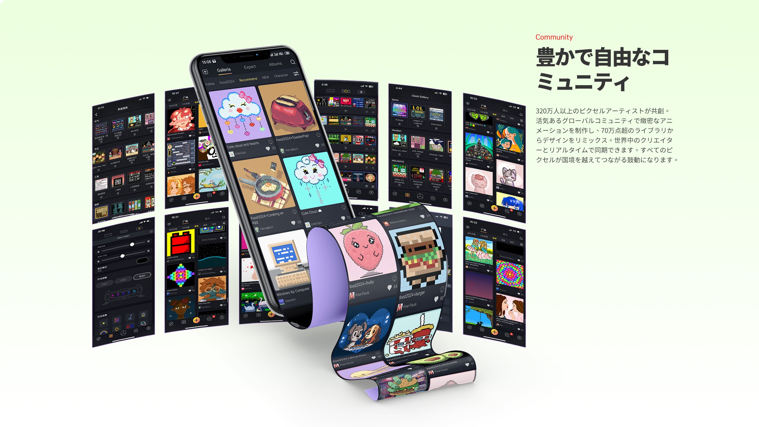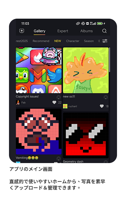 ピクセルアートコミュニティ接続: アプリで簡単に自作ピクセルアートが作成可能。巨大な無料ギャラリーとコミュニティで世界中の作品を探索・共有し、交流できる。