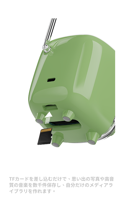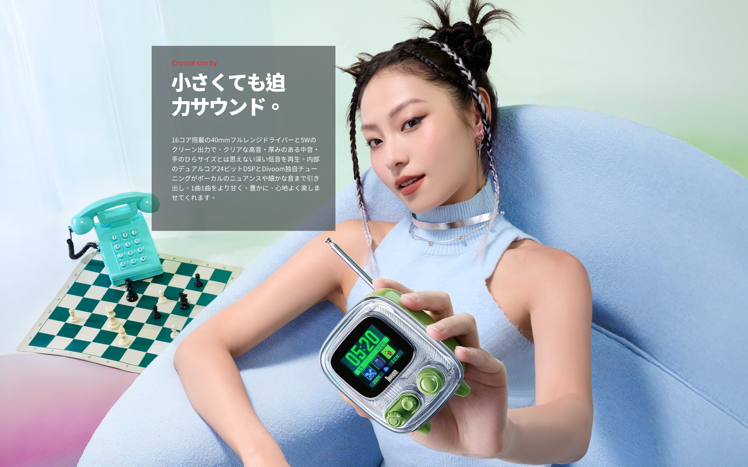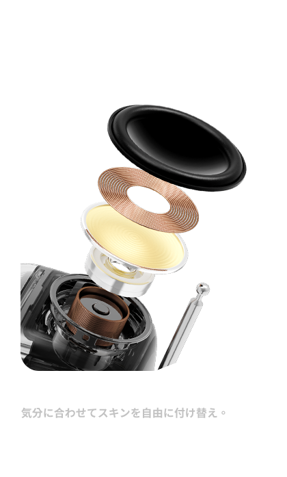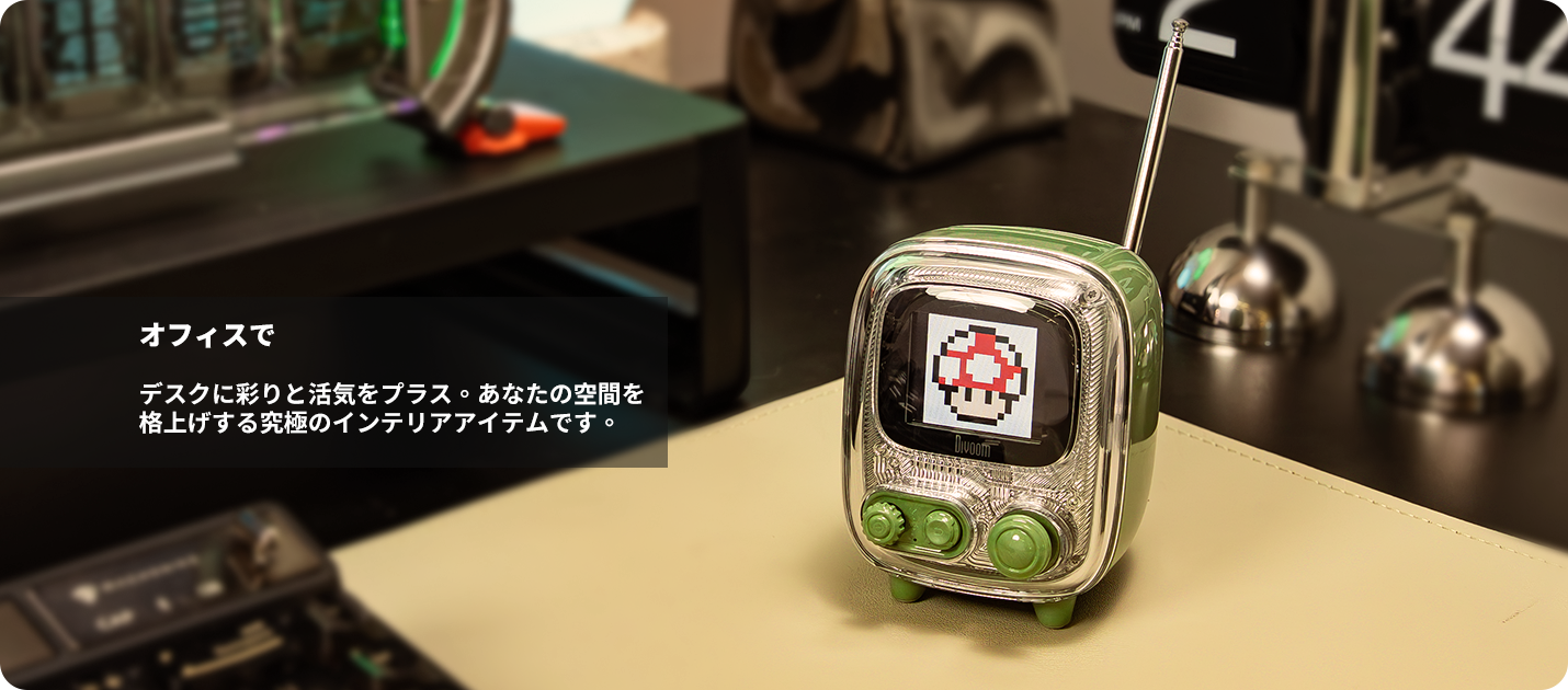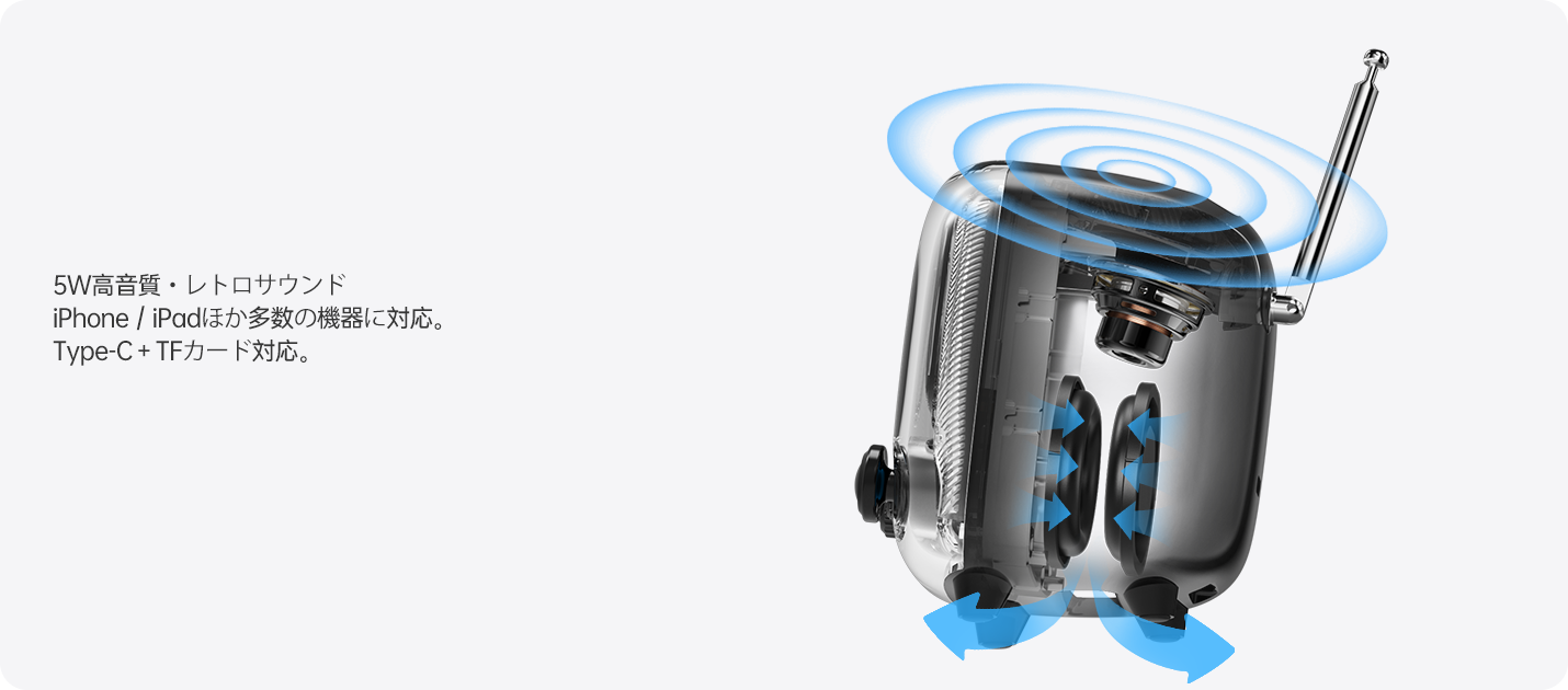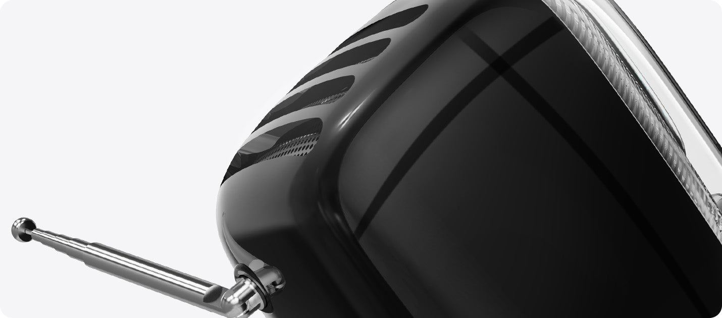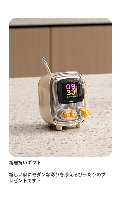 レトロ&モダンの融合: 90年代クラシックPCや昔のテレビをオマージュしたデザイン。フルレンジスピーカーと高品質DSPチップでクリアな音質と安定したFM受信を実現。
