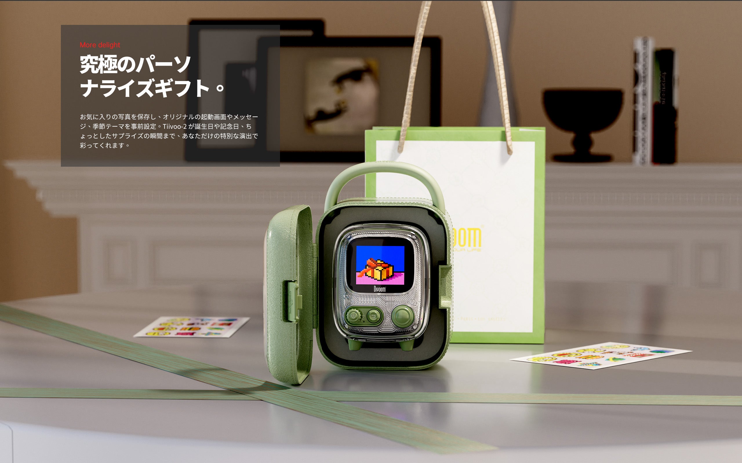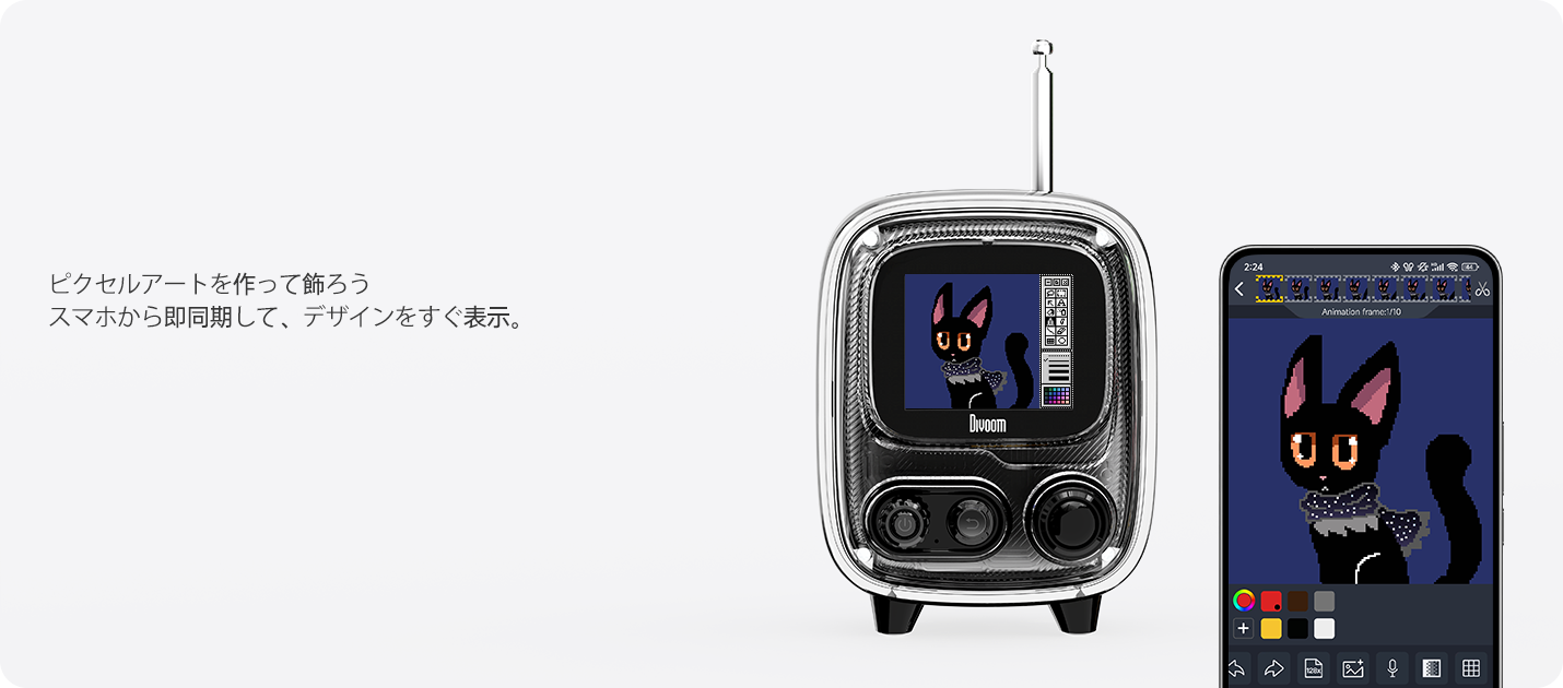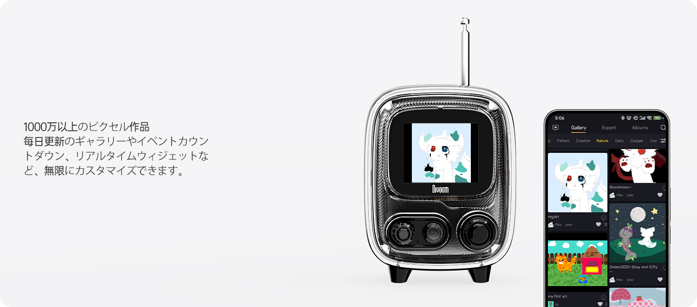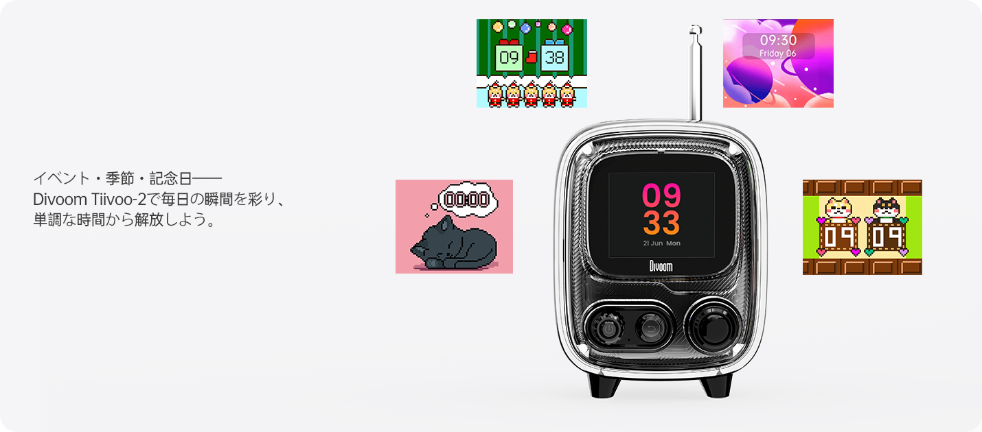 多機能エンターテイメントハブ: デジタルフォトフレーム、ポモドーロタイマー、100+種の時計、ホワイトノイズ、アラームに加え、15種類以上のレトロゲームを内蔵。Divoomアプリで機能拡張可能。