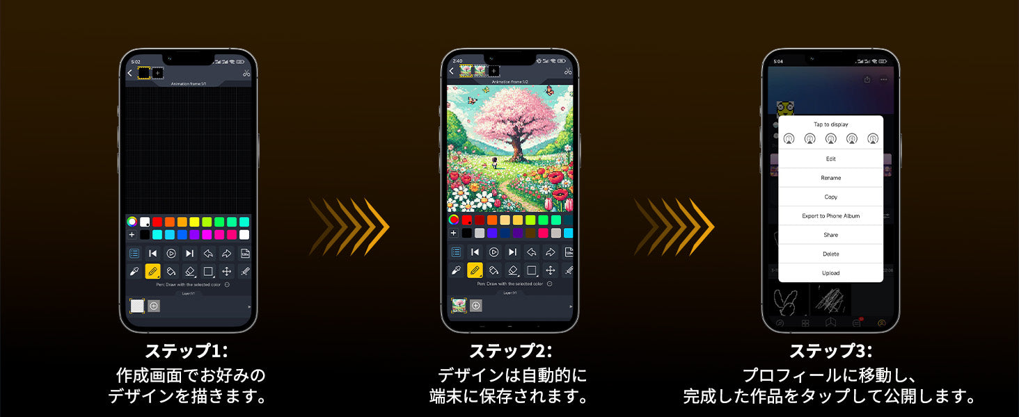 創造性の解放: アプリ内の膨大なピクセルアートライブラリや自作機能で、個性的なアニメーションやテキスト表示を実現。あなたのスタイルを映し出すキャンバスです。