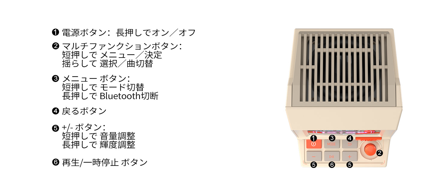 Bluetoothスピーカー&ホワイトノイズ・アラーム機能: 音楽を再生したり、アラームを設定したり、リラックスできる音を楽しんだり。これ1台で遊び心あふれる機能が満載。